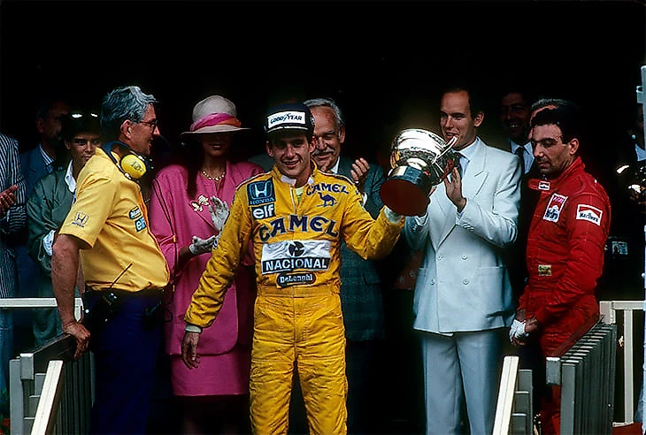 Принц Альбер II вручает Сенне трофей за победу в Монако в 1987 году