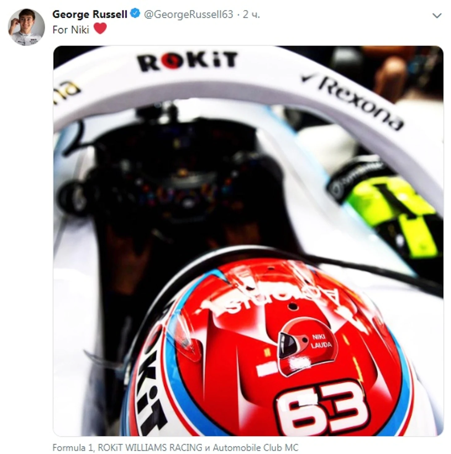 Пилот англичан Джордж Расселл добавил стилизованный шлем Ники в дизайн для своей защиты.
