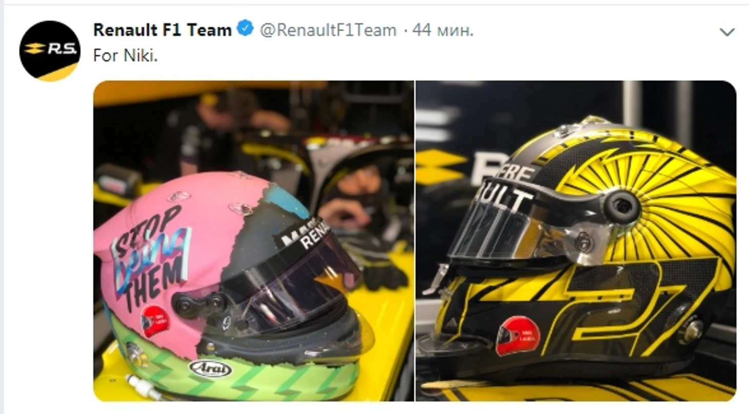 Дизайнеры «Рено» засунули тот же шлем на ливреи пилотов.
