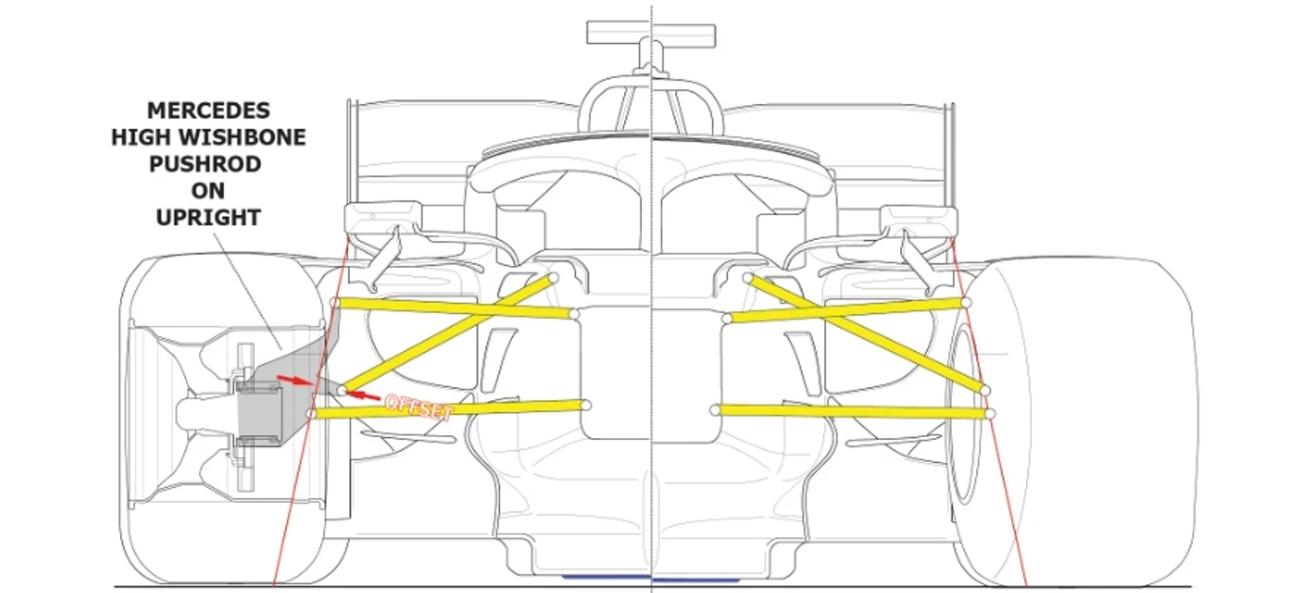 Это та самая система и геометрия, которая до заезда по «Полю-Рикару» стояла только на «Мерседесе» (еще похожая появилась на «Уильямсе», но она, кажется, не заработала). По предположениям многих экспертов, именно она и предоставляет Валттери Боттасу и Льюису Хэмилтону огромное количество сцепления и скорости в медленных поворотах — за счет этого «Мерседес» и доминирует прямо сейчас.