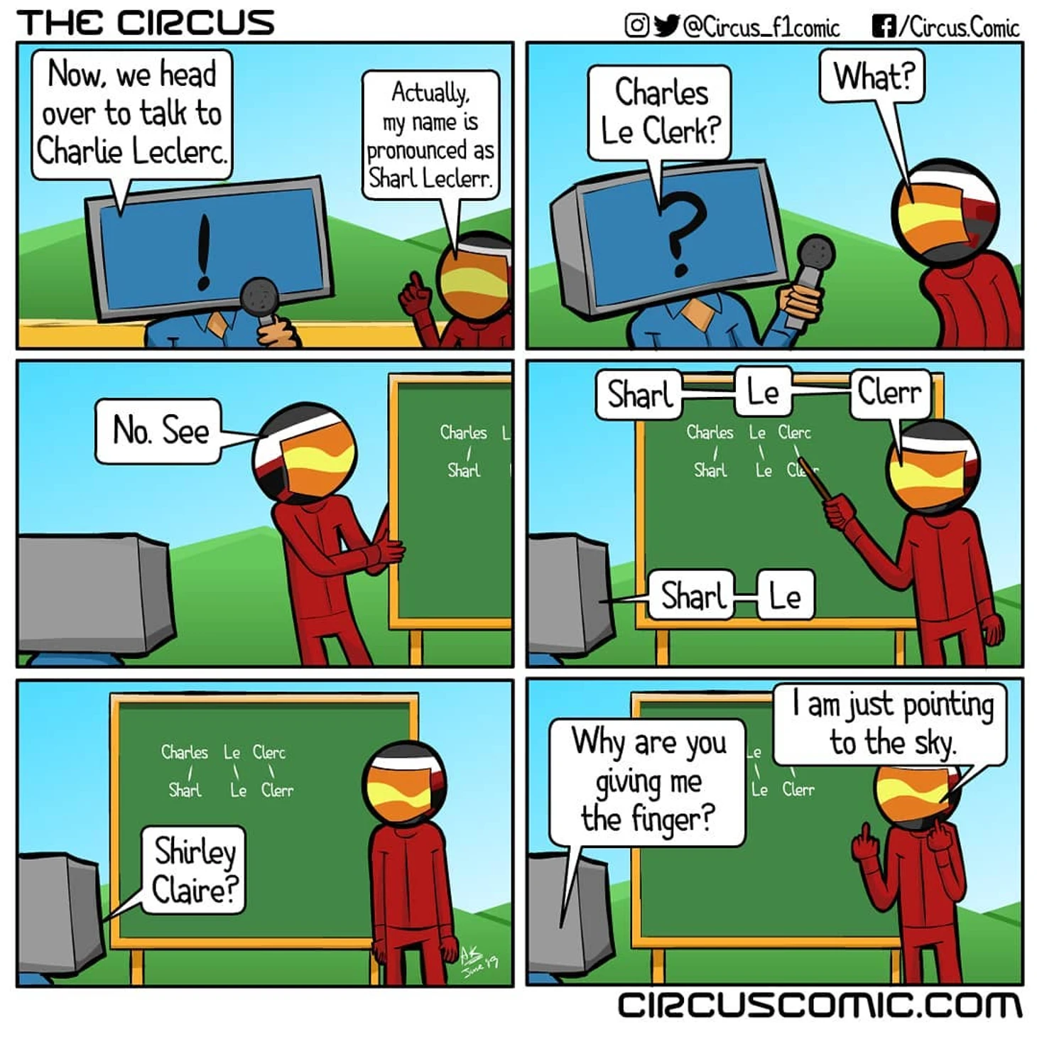 Шарль Леклер за 1,5 года выступления в «Формуле-1» столкнулся со множеством случаев неправильного произношения его имени и фамилии: комментаторы и журналисты в основном англоговорящие и не всегда правильно транскрибировали его французскую фамилию. После перехода в «Феррари» шутки про произношение даже пошли на второй круг — и художник Circus F1Comic высмеял их все.