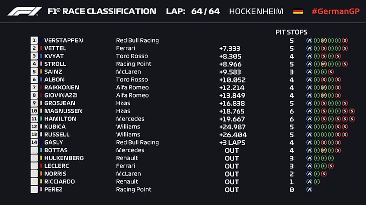 Говорить про остальных я не особо вижу смысла. Только если коротко о каждом. «Рено» мне жаль, особенно Нико Хюлькенберга, у которого в кои-то веки возник шанс финишировать на подиуме, но все вышло совсем иначе. Это дождь, друзья! Александр Албон и Кими Райкконен также провели сильную гонку. Шокировал Джовинацци лучшим кругом, но это продолжалось недолго. Особенно, если учитывать, что тот же лучший круг около двух раз показал сам Квят. Лично мне, по собственным причинам, было особо обидно за Сайнса, который после последнего рестарта гонки сдал и упустил возможность подняться на подиум.