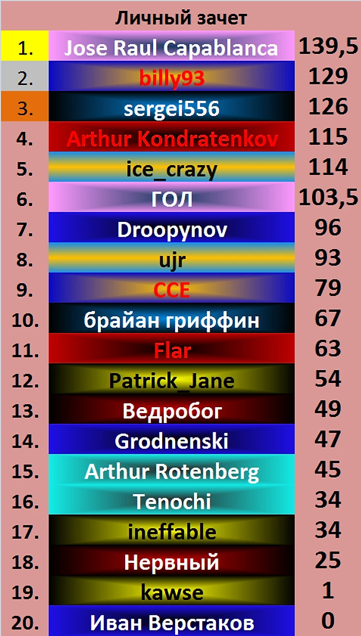 ПК-Феттель ЛК-Ферстаппен НП-Ферстаппен(5) 1.Феттель(0) 2.Леклер(18) 3.Хэмилтон(25) 4.Боттас(15) 5.Ферстаппен(12) 6.Албон(25) 7.Риккиардо (12)8.Райкконен(4) 9.Квят 10.Сайнс