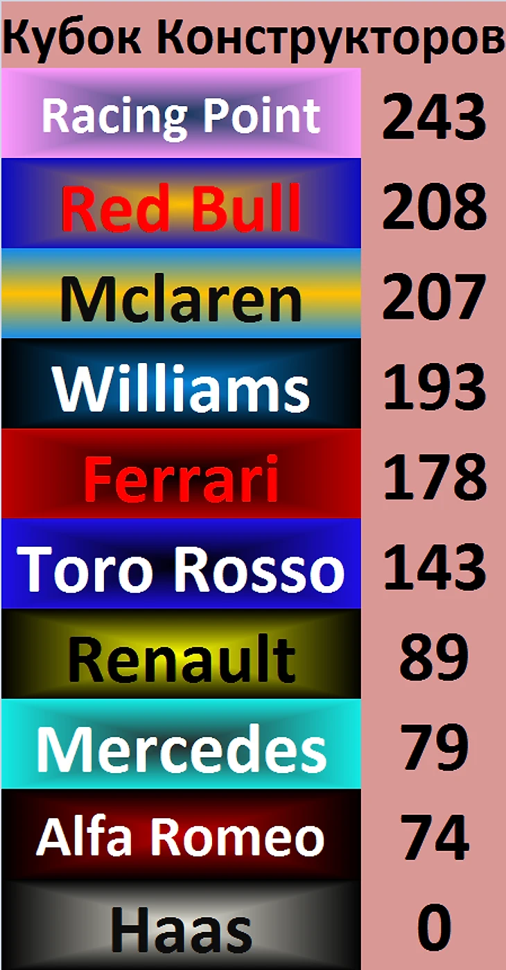 ПП - Феттель ЛК – Хэмилтон(5) НП - Стролл 1. Феттель(0) 2. Леклер(18) 3. Хэмилтон(25) 4. Ферстаппен(10) 5. Боттас(12) 6. Албон(25) 7. Риккардо(12) 8. Хюлкенберг(12) 9. Квят 10. Перес(12)