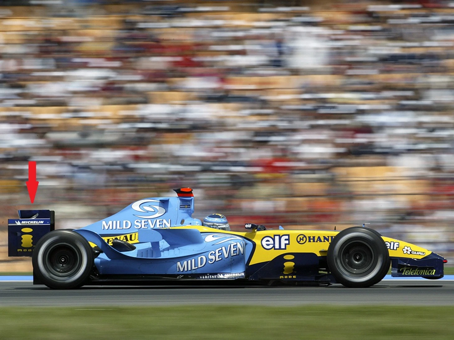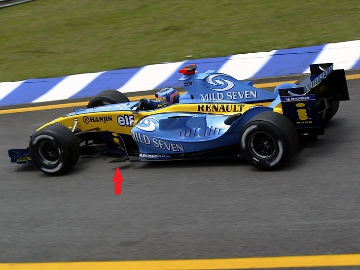 Начнем, пожалуй, с популярного. Как и у многих других команд, (к примеру, «БАР» и «Уильямс»), на болиде «Рено» использовали специальные шипы, расположенные на боковых дефлекторах. Особенность шипов французов заключалась в их длине. Если мы сравним их с аналогами, то тут же увидим разницу.