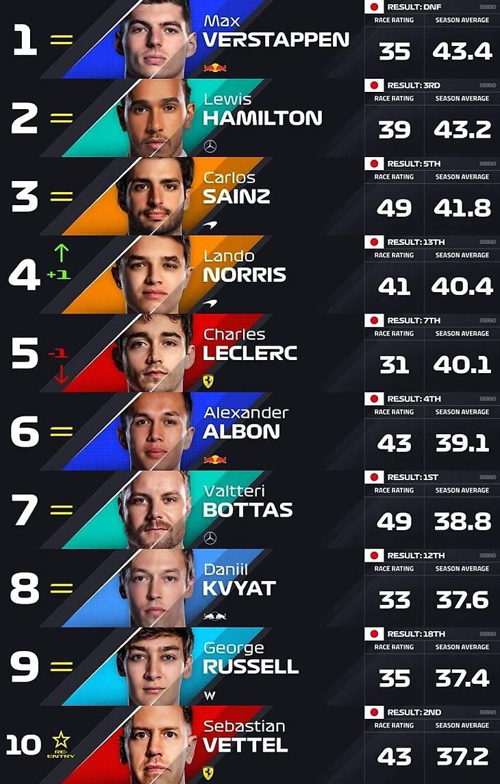 Судя по видимым оценкам, эксперты «Формулы-1» признали лучшими на Гран-при Японии Карлоса Сайнса из «Макларена» и Валттери Боттаса из «Мерседеса». Третье место получил Даниэль Риккардо из «Рено» (45 баллов).