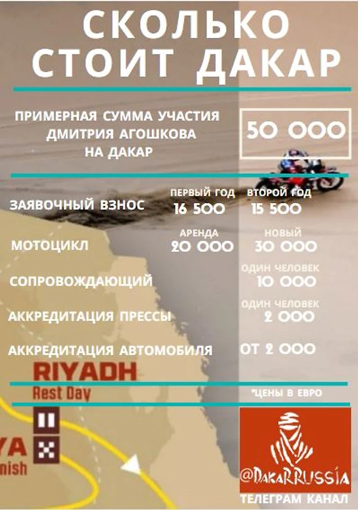 Подготовительный этап перед Дакаром, я считаю это весь год: тренировки, выезды, участия в соревнованиях. А это перелеты, питание, проживание, аренда авто, накладные расходы, запчасти, это очень сложно оценить.