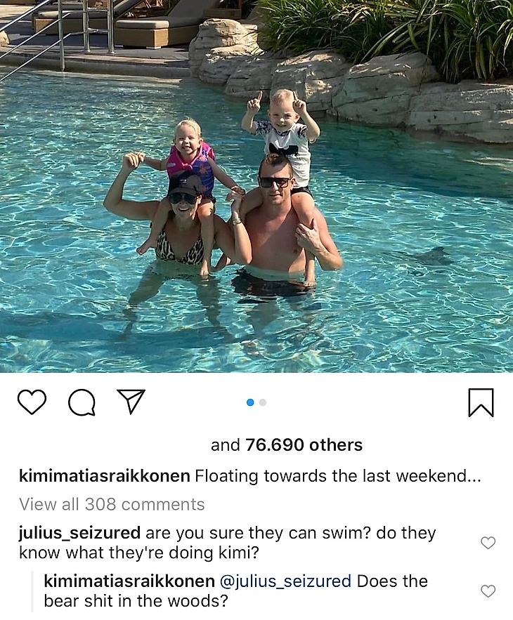 Перед Гран-при Абу-Даби финн выложил фотографии с женой и детьми с подписью «Вплывая в последний уик-энд» – и в комментарии пришли иронизирующие болельщики.