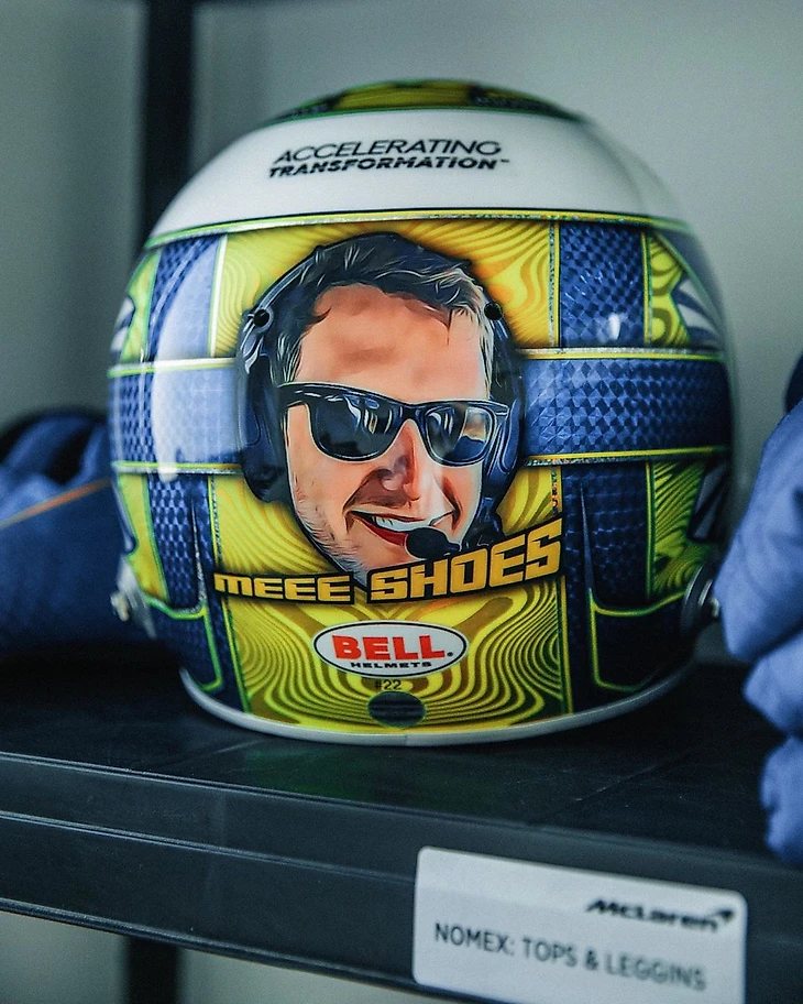 В честь этого Ландо подготовил особенный прощальный подарок: поместил портрет Джарвиса на шлем и пообещал отдать его инженеру после финиша. Только посмотрите, как растрогался Эндрю.