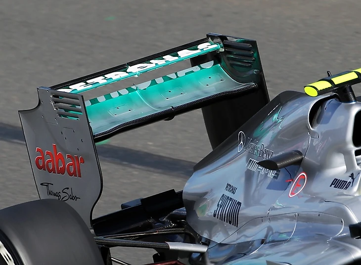 Когда пилот поднимал пластину заднего анктикрыла, включался воздухозаборник, который перенаправлял часть потока на переднее антикрыло. Там по большим давлением пластины тоже поднимались, снижая угол атаки, а вместе с ним и лобовое сопротивление. В итоге скорость на прямых повышалась.
