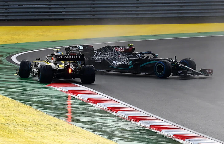 «Сначала меня развернуло в первом повороте – я пытался объехать вылетевшего Риккардо на «Рено» или кто там это был, – объяснил Валттери. – Затем я столкнулся с кем-то, и машина уже не ощущалась прежней. Я быстро нагонял пелотон, и мне показалось, что можно атаковать – Но колеса заблокировались, машина заскользила на воде на внутренней стороне поворота – и я ударил «Рено».