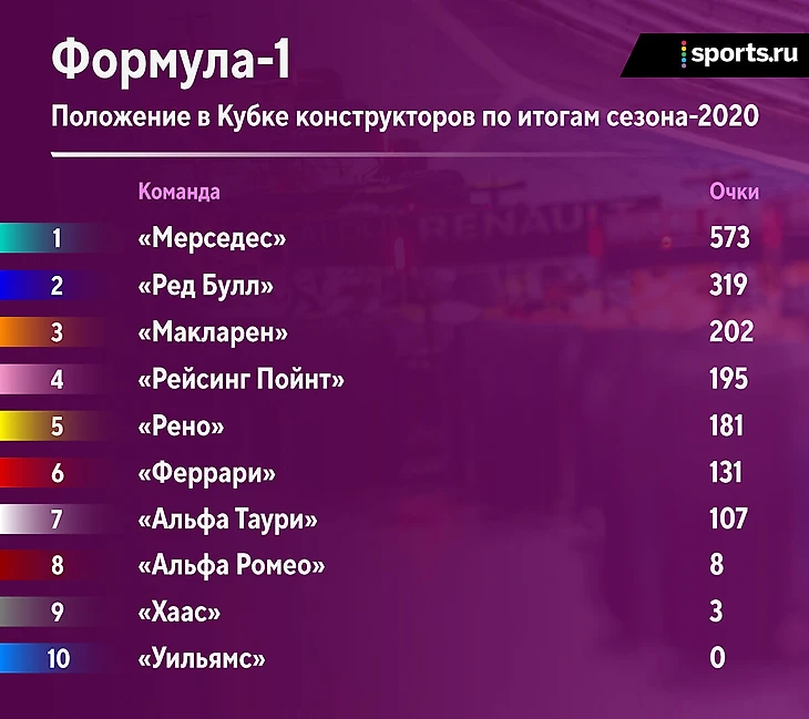 «Макларен», «Рейсинг Пойнт» и «Рено» рубились вплоть до Гран-при Абу-Даби – в итоге все решил класс Ландо Норриса и Карлоса Сайнса, провальная вторая половина сезона Стролла и все те же сходы Переса. А еще скандал с копированием тормозных воздуховодов «Мерседеса» – «Рейсинг Пойнт» лишили 15 очков, которых не хватило до топ-3.
