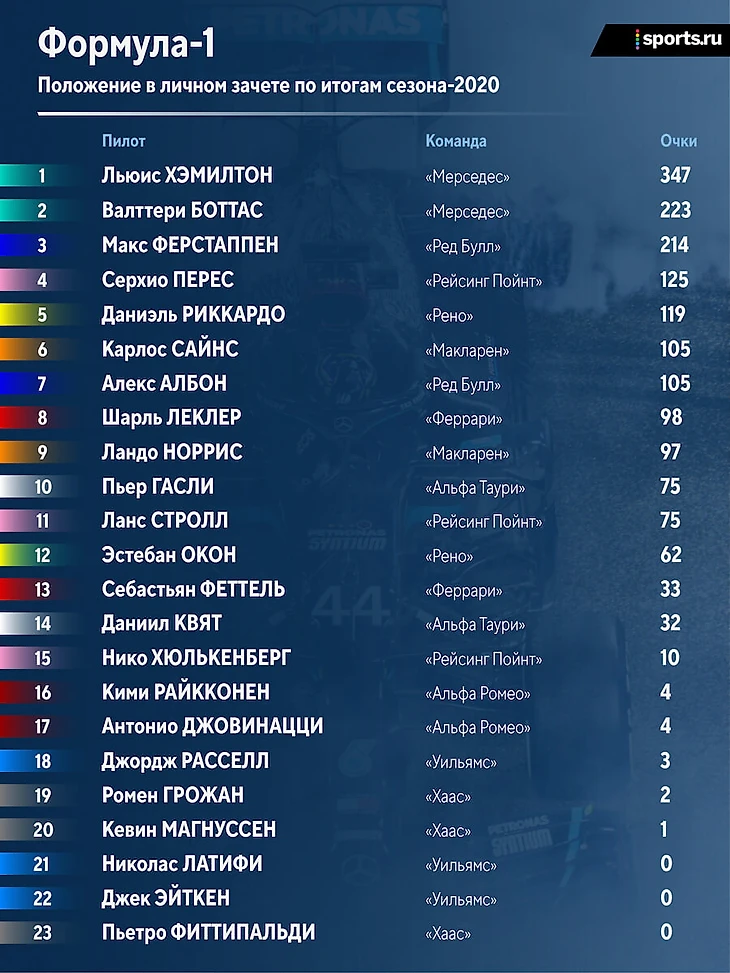 Из-за COVID-19 и травм Ромена Грожана на старт Гран-при выходили целых 23 гонщика – в итоге суперзапасной Нико Хюлькенберг обогнал восемь из них, хотя стартовал лишь дважды. Джордж Расселл не набрал ни одного очка в 16 гонках за «Уильямс», зато единственный заезд в составе «Мерседеса» принес сразу три балла – первых для него в «Ф-1» (правда, британец заслуживал гораздо большего).