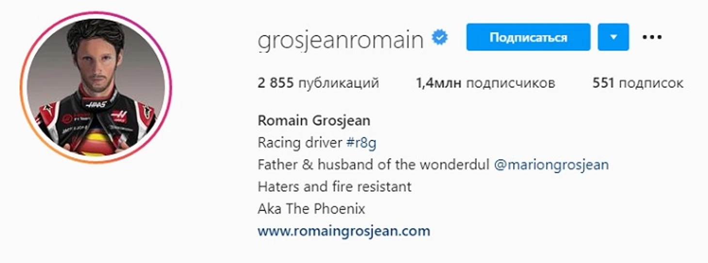 Сразу после аварии Ромен изменил подпись в инстаграме. Теперь он не только гонщик, отец и муж, но и Феникс, устойчивый к хейтерам и огню, а на аватарке – отсылка к Супермену.
