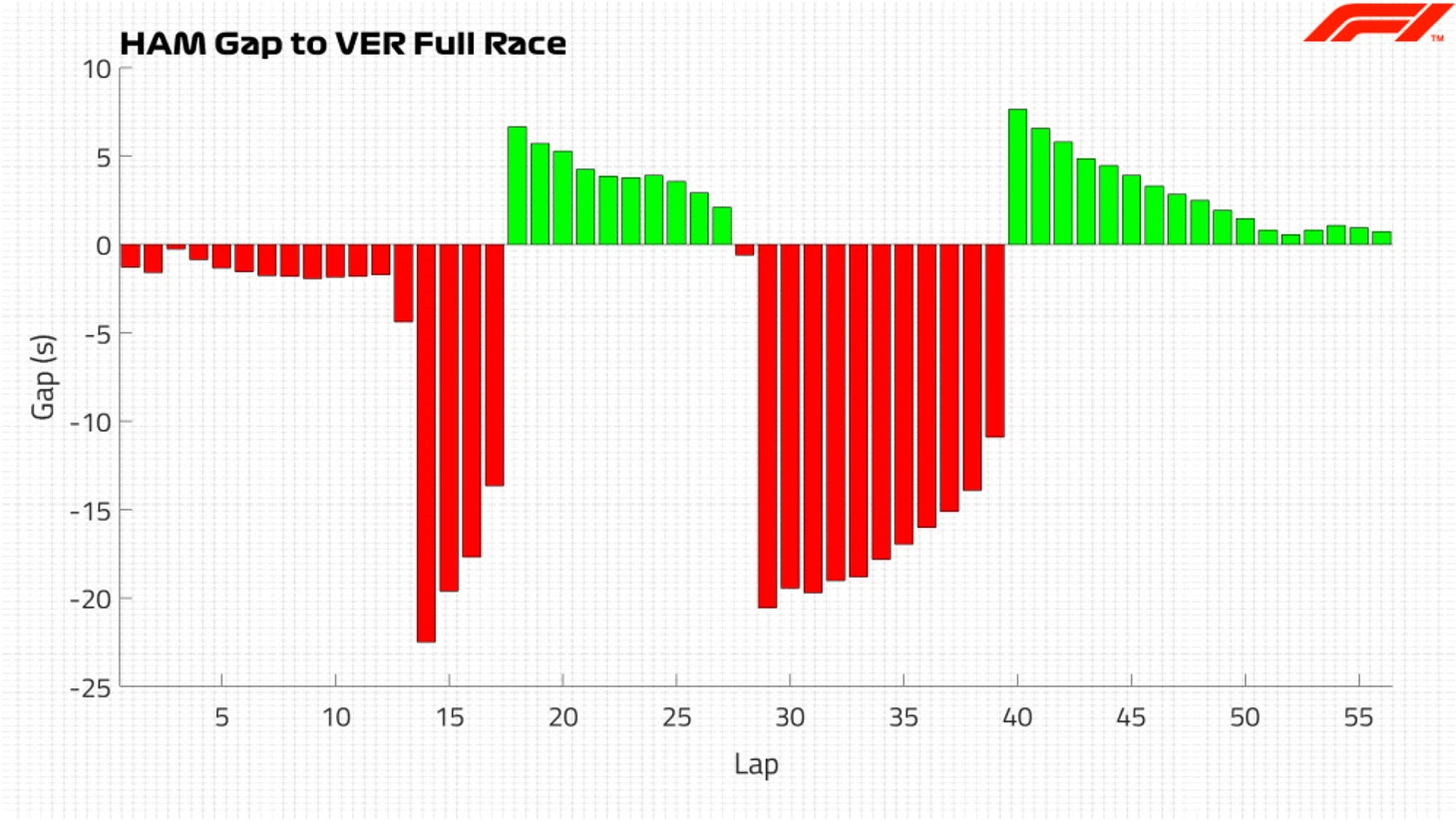 Расчетное время, потерянное из-за пит-стопа в Бахрейне, составляет 23 секунды, но к концу 14 круга Ферстаппен имел преимущество над Хэмилтоном лишь 22.5 секунды. На самом деле Ферстаппен потерял 22.88 секунды во время своего первого пит-стопа, поэтому, если бы он остановился на 14-м круге, отставал бы примерно на 0.4 секунды от Хэмилтона.