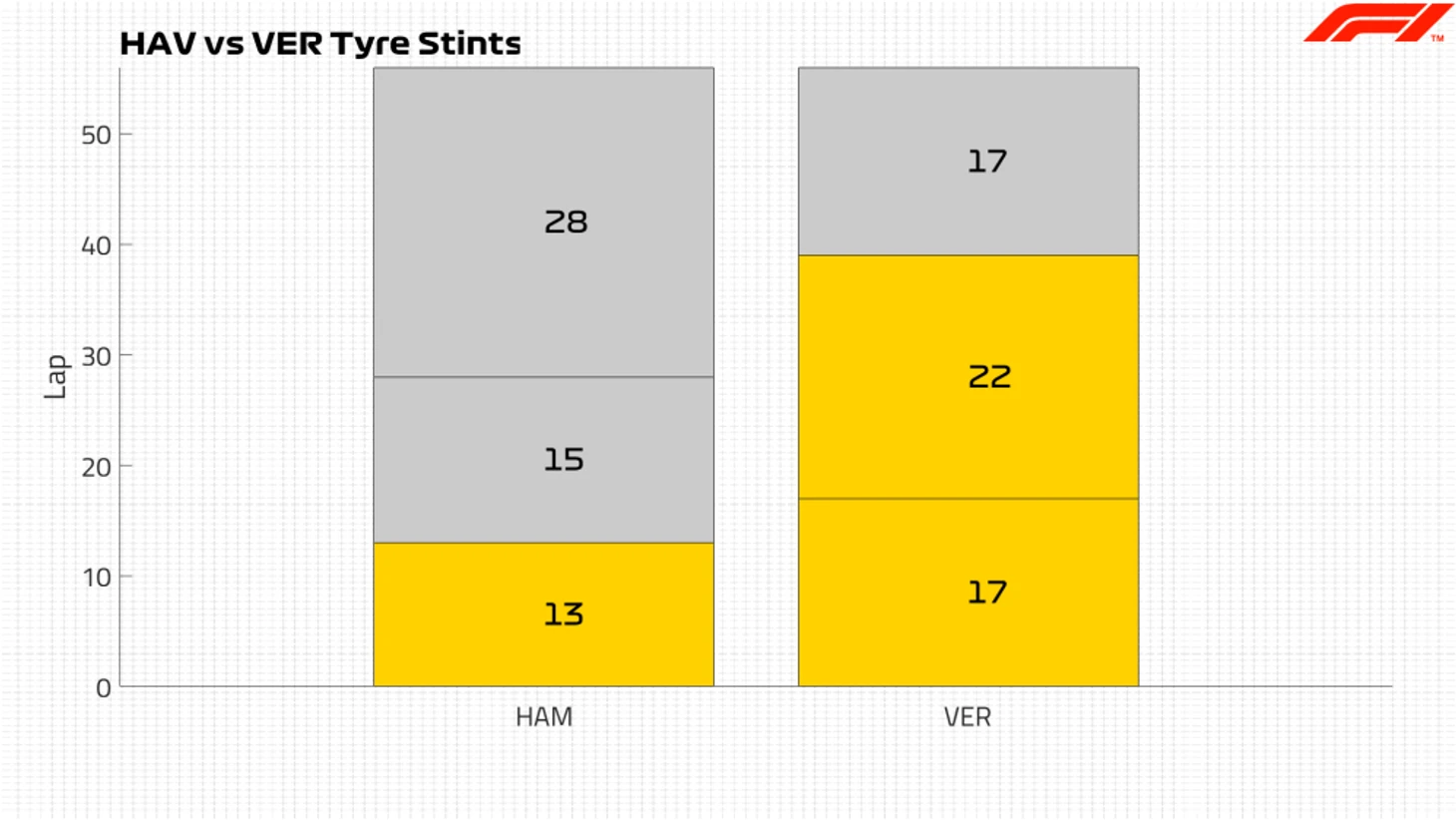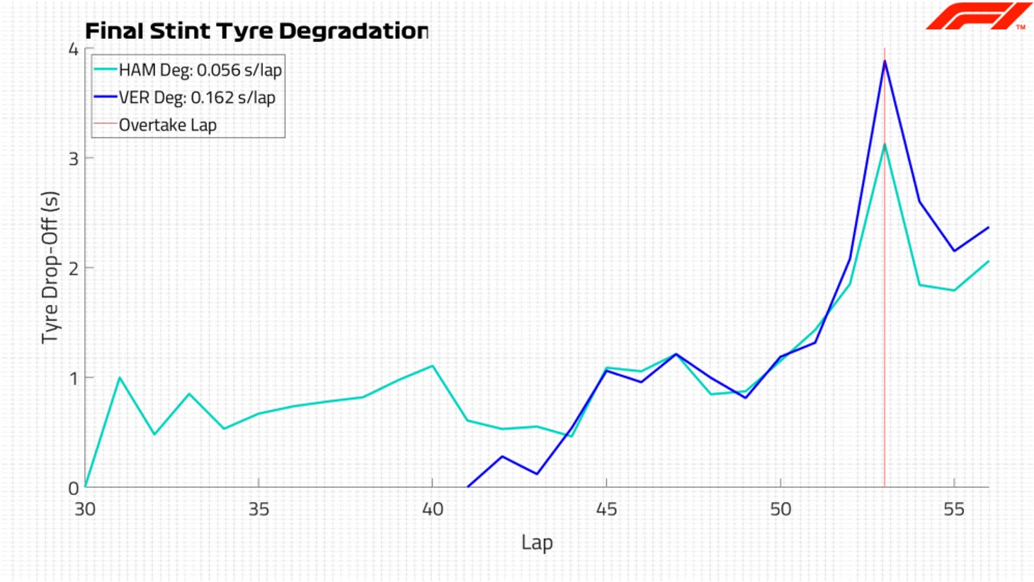 Важно отметить, что на 53-м круге - круге, на котором Ферстаппен обогнал Хэмилтона - оба гонщика были примерно одинаковы по общему износу шин. После того, как Ферстаппен вернул позицию за превышение пределов трассы, он оказался в невыгодном положении: на этом этапе он расходовал больше резину, чем Хэмилтон.