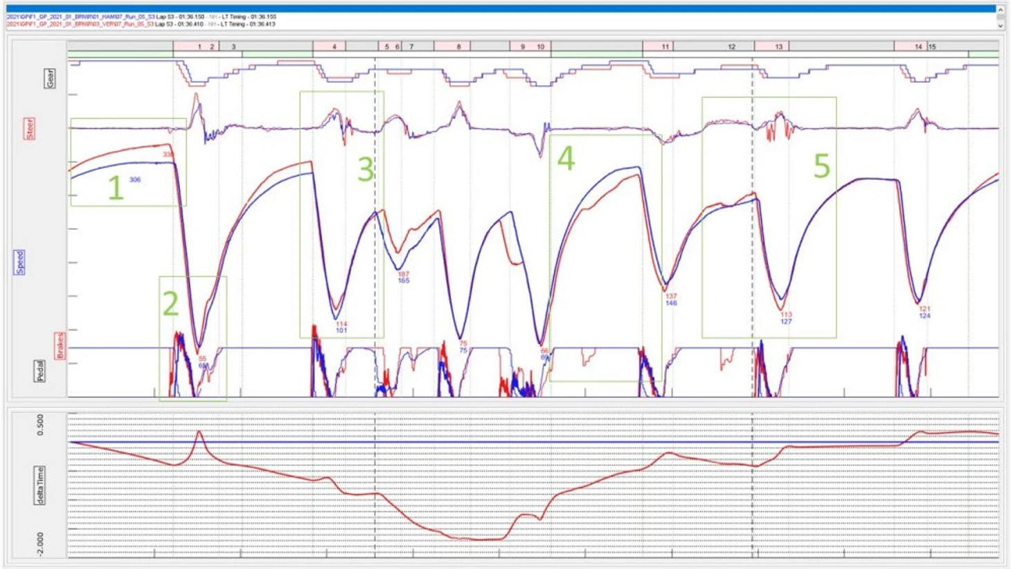 1. Как видно на практике, Ферстаппен снова демонстрирует большую скорость в 5-м повороте, но вынужден идти на компромисс в 7-м повороте, поднимая ногу с педали газа. Однако в целом Ферстаппен выглядел быстрее Хэмилтона на этом участке трассы.