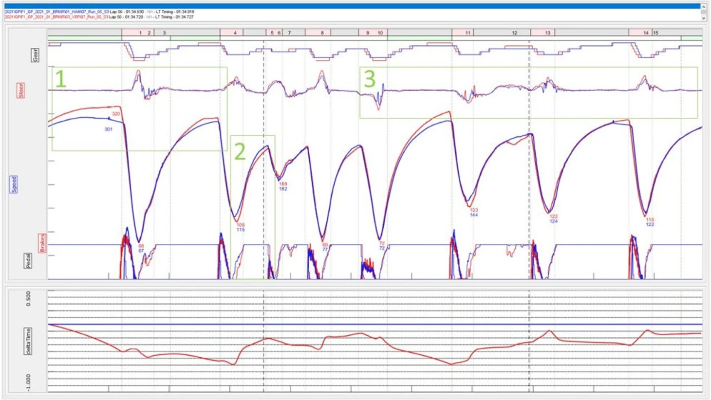 Понятно, что Ферстаппен может добиться больших успехов в поворотах на средних и высоких скоростях, имея большую скорость на апексе, чем у Хэмилтона. Хэмилтон немного быстрее на прямых, но не настолько, чтобы компенсировать время, отыгранное Ферстаппеном в поворотах.