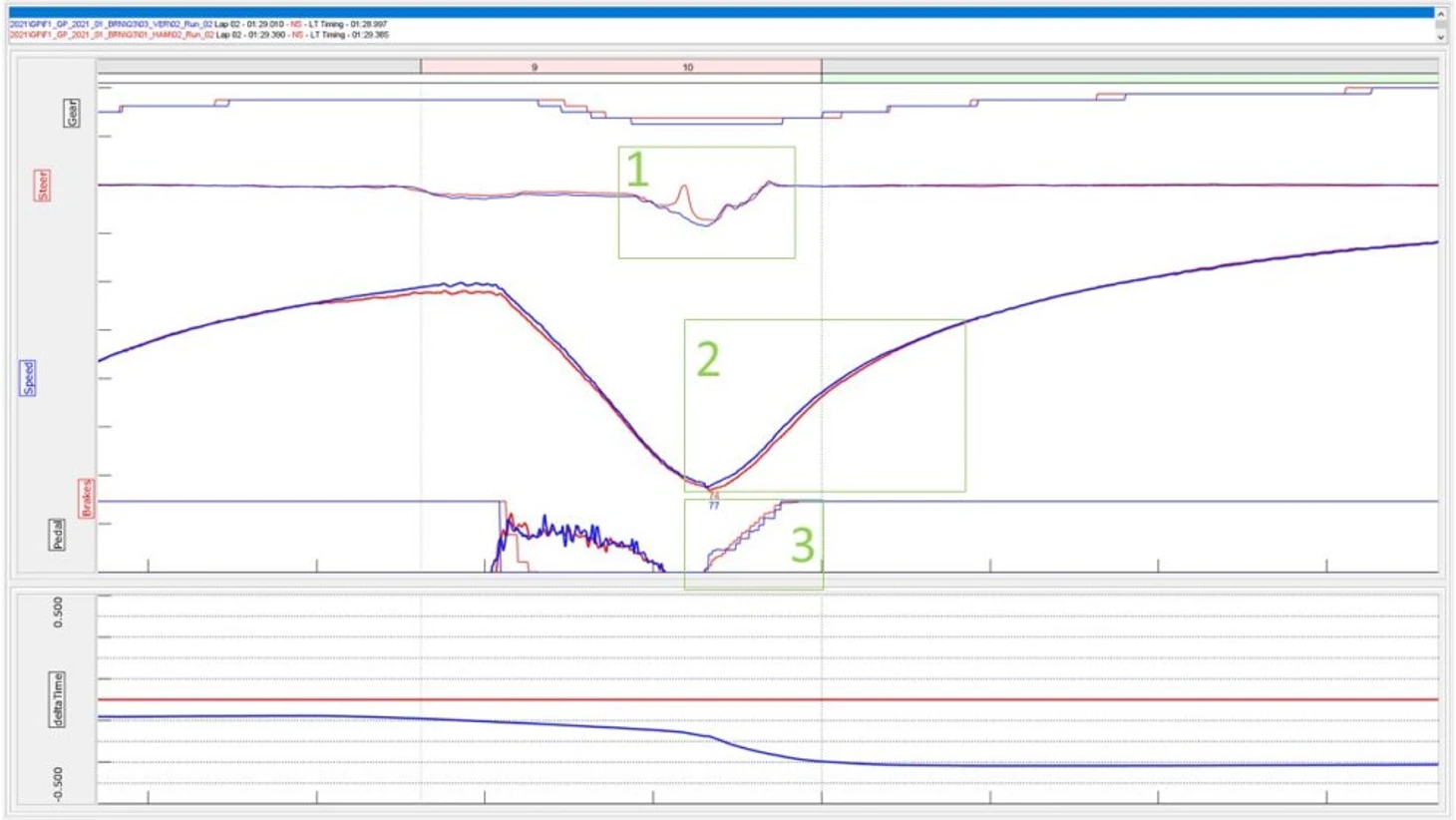 Здесь мы сравним 43-й круг, где Ферстаппен преследует Хэмилтона на своих новых шинах. И снова на графике сверху вниз показаны передача, усилие рулевого управления, скорость, газ / тормоз и дельта-времени. На этот раз Ферстаппен – красный, а Хэмилтон – синий.