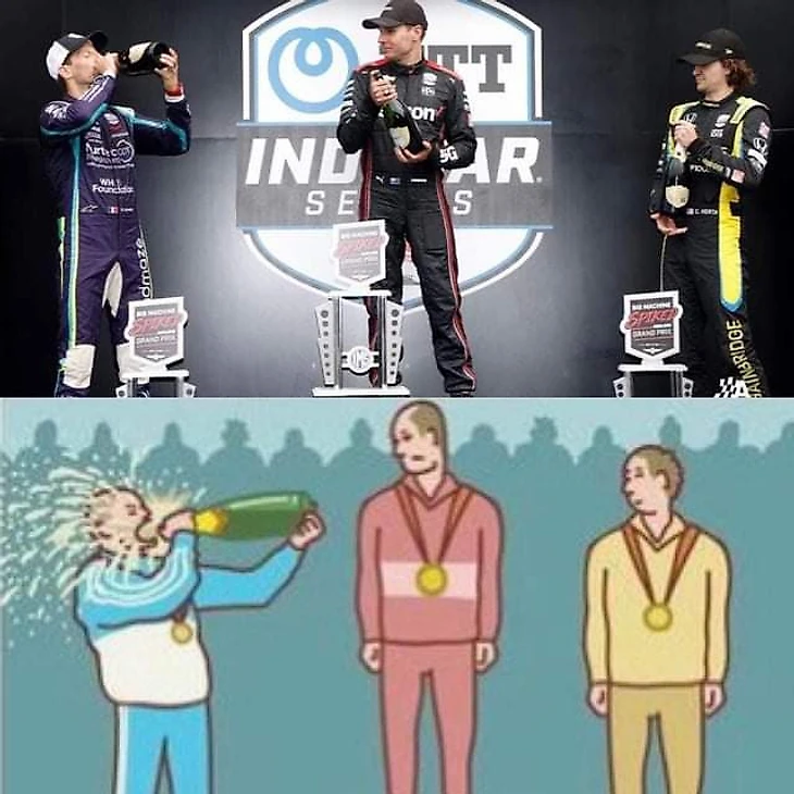 Бывший гонщик «Ф-1» ворвался на подиум быстрейших гонок США – и повторил мем с наглым спортсменом и шампанским