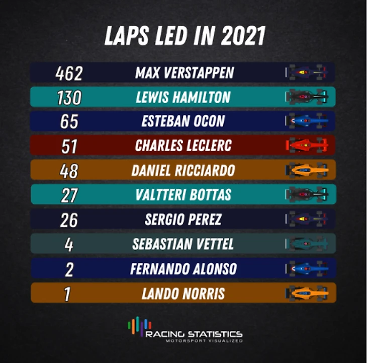 У Макса в этом сезоне 462 круга лидирования, что более чем в 3 раза превышает количество таких кругов у идущего вторым Льюиса Хэмилтона. Из 20 гонщиков хотя бы 1 круг лидирования есть у 10