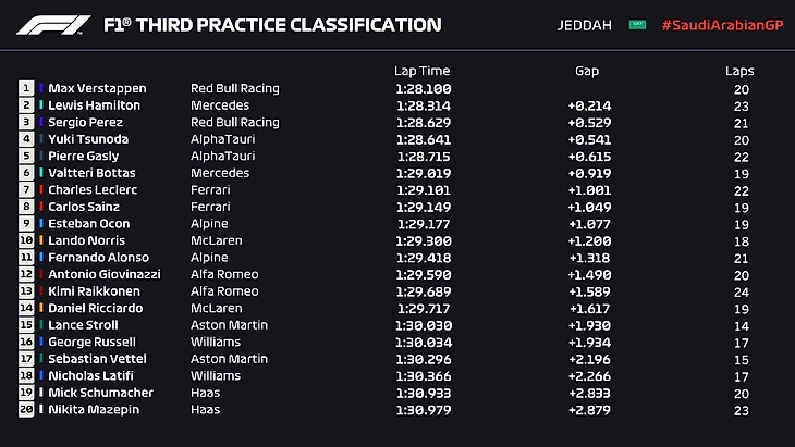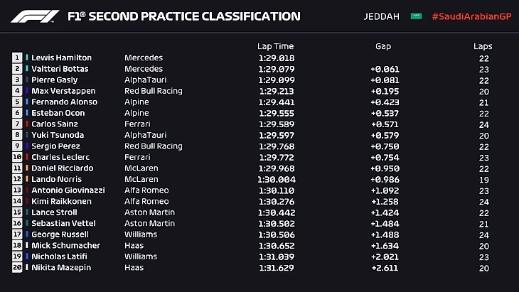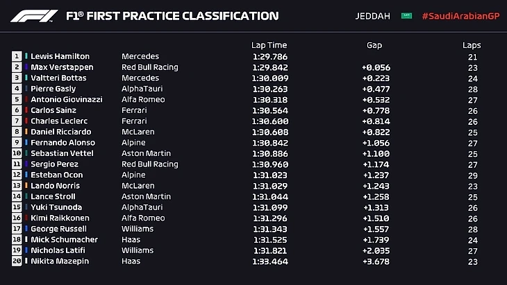 - К моменту практики состояние асфальта улучшилось и сцепление с трассой тоже, именно это позволило показать хорошие времена в тренировке. - Пьер Гасли и Никита Мазепин чуть не врезались с Льюисом Хэмилтоном, но, к счастью для всех, все обошлось. Льюис превысил скорость под желтыми флагами, но позже резко замедлился, нужно отметить, что Никита хорошо среагировал и смог избежать столкновения. После всего произошедшего его вызвали к стюардам, но никакого наказания не было. "Флаги были по ошибке и на бортовом панно индикации не было" - таков был вердикт.