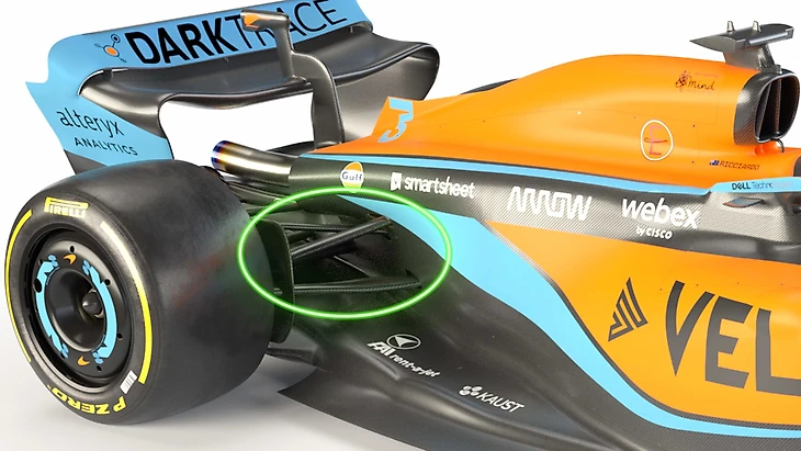 Общая стратегия охлаждения не сильно отличается от предыдущей машины «Макларена». Боковая стойка толще в передней части, что аналогично тому, что мы видели у других команд, но это, скорее всего, для управления потоком.
