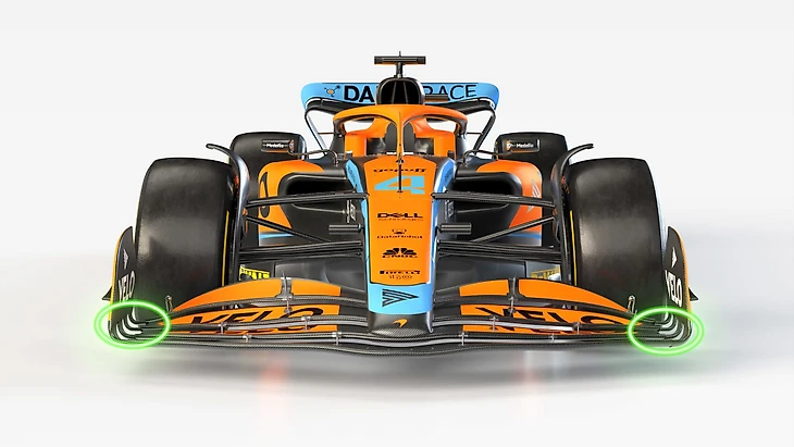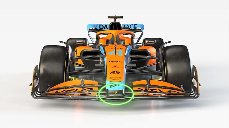 Концевая пластина переднего крыла слегка изгибается в средней части, особенно заметно на задней кромке. Возможно, «Макларен» использует это для того, чтобы увеличить размах и эффективность пикирующей плоскости, которую они допускают на внешней стороне концевой пластины.