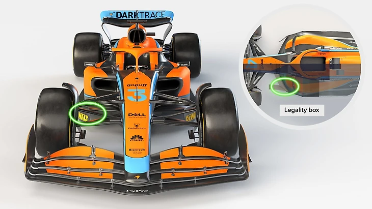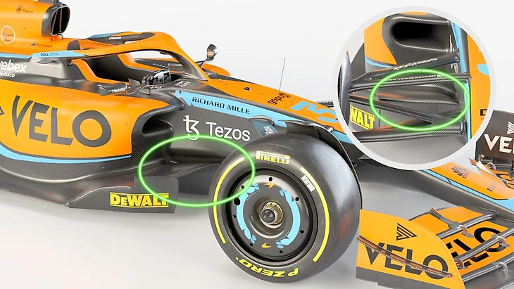 Как и в случае с «Астон Мартин», «Макларен», похоже, использует внешнюю из четырех полос, разрешенных перед боковыми стойками, для копирования дефлекторов. Он короче, чем у «Астона», но резко наклонен внутрь, когда проходит через край днища.