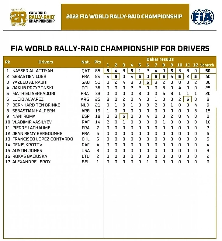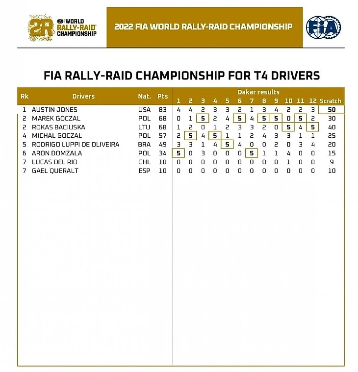 Язид Аль Раджи (51 очко) будет представлять команду Overdrive Racing, в нее же перешел и аргентинец Себастьян Альперн (19). За команду X-raid поедут пилоты Денис Кротов (4), Куба Пшигонски (36) на MINI Buggy и джентельмен-драйвер Стефан Шотт на MINI John Cooper Works Rally, за команду SRT - Матьё Серрадори (33) на Century CR6, за BENZINA ORLEN TEAM - Мартин Прокоп на Форде.