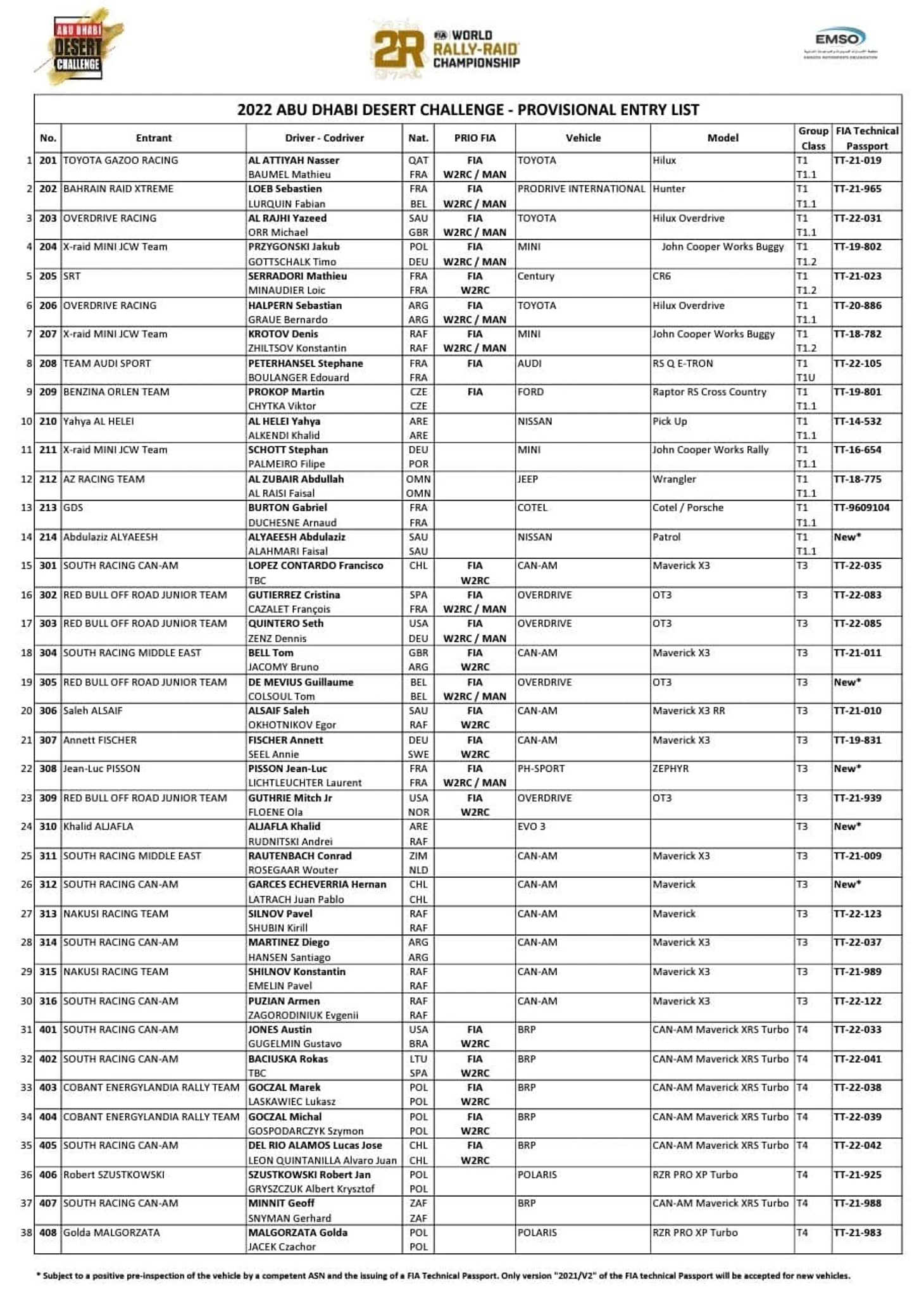 Emirates Motorsports Organization (EMSO) объявила список из 132 участников (38 автомобилей) 31-го выпуска гонки Abu Dhabi Desert Challenge, в который вошли лучшие гонщики мира. 14 автомобилей Т1, 16 - Т3, 8 - Т4, среди них 23 пилота листа приоритета! Во втором этапе Чемпионата Мира по ралли-рейдам примут участие победитель "Дакара-2022" Нассер Аль-Аттия (85 очков) на автомобиле Toyota Hilux, обладатель второго места Себастьян Леб (84 очка) на Prodrive Hunter, Стефан Петерансель за рулем Audi RS Q E-tron.
