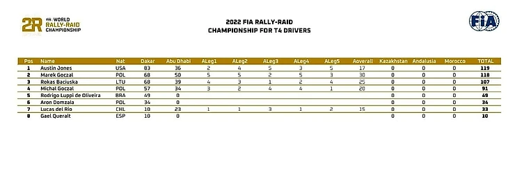 По итогам двух гонок "Дакар" и ADDC Остин Джонс удерживает первую строчку в классификации (119 очков), несмотря на свое четвертое место на последней гонке. У Марека второе место и 118 очков, у Рокаса Бацюшки 91 очко.
