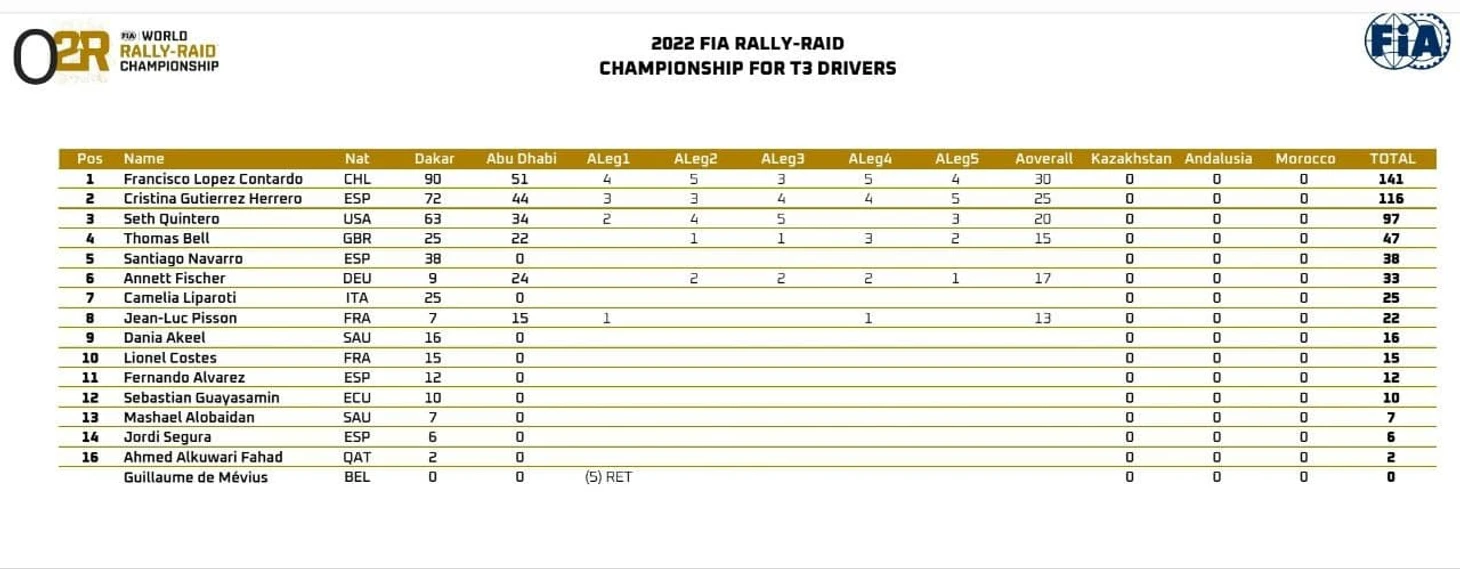 По итогам двух гонок "Дакар" и Абу-Даби Дезерт Челленж" у Чалеко 141 очко, у Кристины 116, а у Сета 97. Кстати, в зачете штурманов на первое место вышел Франсуа Казале, потому что с Чалеко ехал Пауло Чечи, а его дакаровский штурман Хуан-Пабло Латрач заранее подтвердил свое участие в гонке с Эрнаном Гарсесом, а когда Чалеко в последний момент решил ехать, не стал нарушать договоренность со своим другом.
