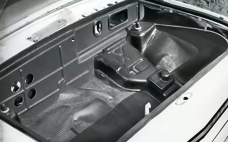 Спереди скрывались бензобак, запасное колесо, грелка с водой для стеклоомывателя и набор инструментов.