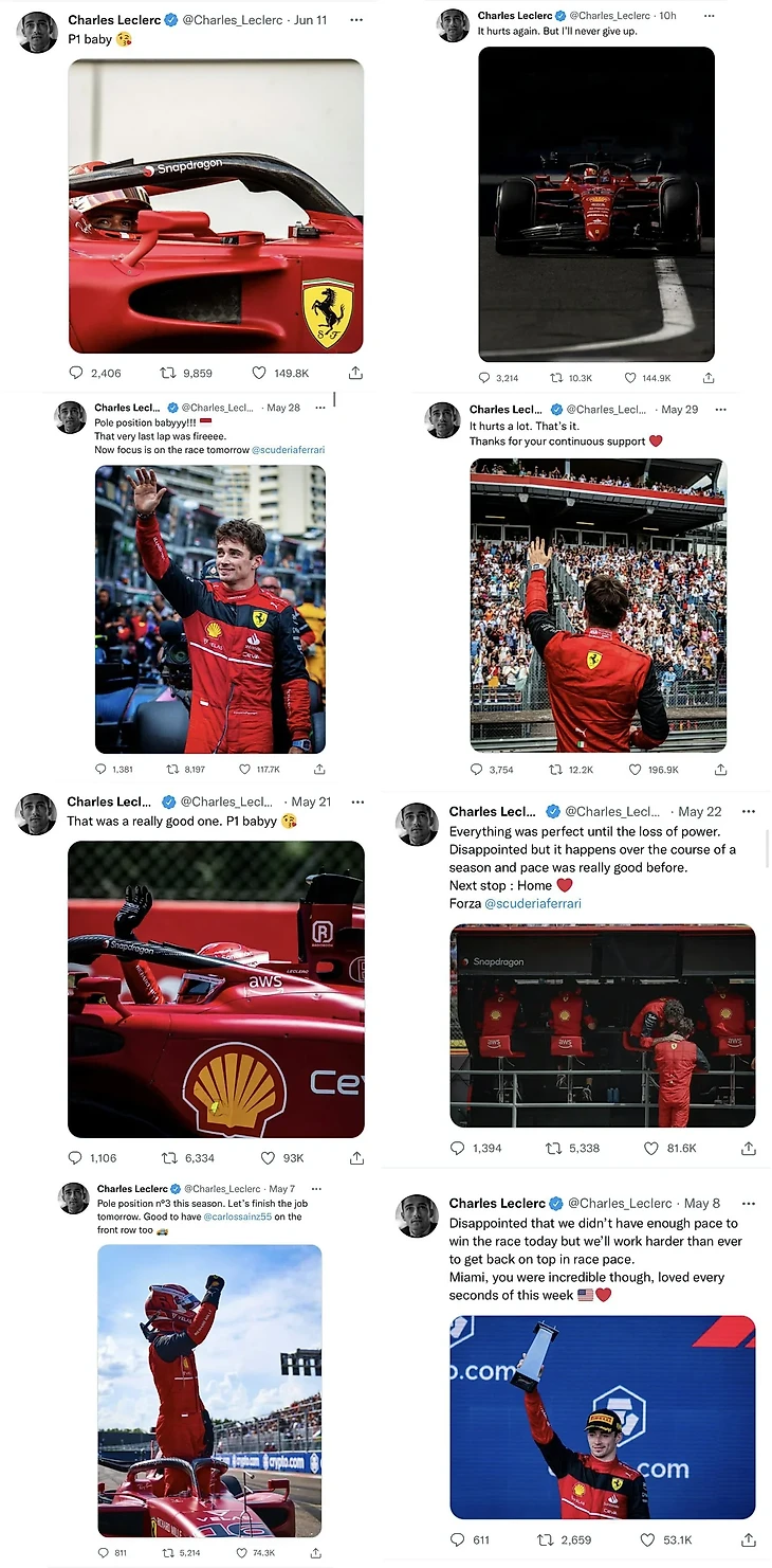 Гран-при Испании: Квалификация – «Вот это был реально хороший [круг]! Первая позиция, детка!». После гонки – «Все шло идеально, пока не пропала мощность. Разочарован, но такое случается в течение сезона, и до этого темп был хорош. Следующая остановка – дом ❤️ Форца «Феррари»!