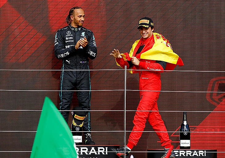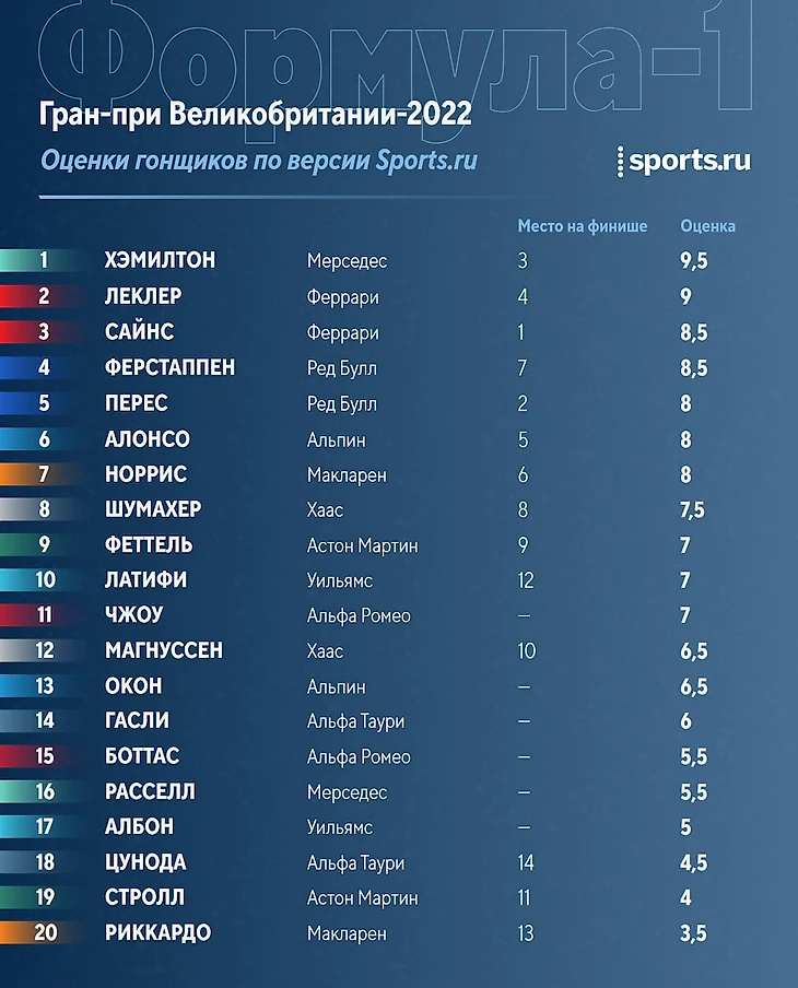 Шоу в Сильверстоуне стало самым содержательным как минимум в нынешнем сезоне «Формулы-1». Огромная авария на старте (к счастью, без серьезных последствий), победа Сайнса, рекордный подиум Хэмилтона, всего 14 болидов на финише, жаркая борьба за топ-3 на последних кругах, впечатляющие выступления главных неудачников сезона – Шумахера и Латифи. А также поломка болида Ферстаппена и поражение Леклера – снова из-за непонятных решений мостика «Феррари». Возможно, рейтинг Sports.ru слегка поднимет настроение монегаску – хотя бы где-то он в призах.