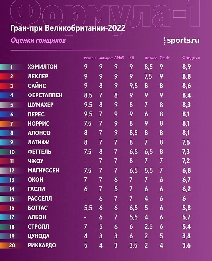Льюис догнал своего напарника по среднему баллу от Sports.ru за сезон, хотя еще несколько гонок назад разница казалась колоссальной. Впрочем, разрыв крошечный, и расклад еще много раз поменяется по ходу года, да и Боттас с Пересом и Норрисом недалеко.