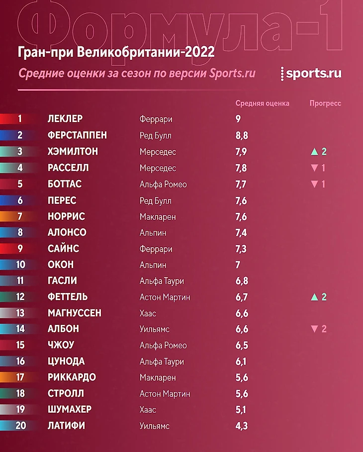Леклер и Ферстаппен продолжают сражаться в своей лиге – вряд ли кто-то из простых смертных бросит вызов лидерам. Шумахер и Латифи классно провели уик-энд в Британии, но по-прежнему уверенно занимают последние строчки.