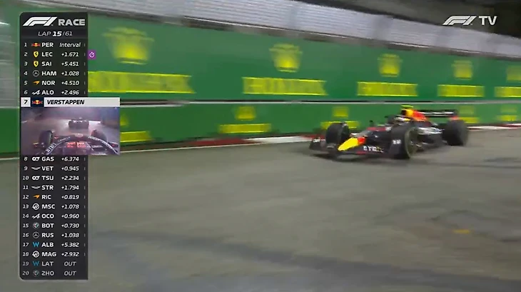 Кроме того, трансляции заполнили инфографикой: к примеру, искусственный интеллект теперь самостоятельно просчитывает (исходя из темпа пилотов на момент расчетов), через сколько догоняющий может настигнуть преследуемого. К примеру, вот так в конце Гран-при Японии этого года компьютер показал, что Серхио Перес догонит Шарля Леклера через два круга – что в итоге оказалось правдой: