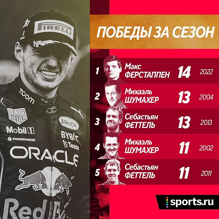 До нидерландца лучшими были Михаэль Шумахер и Себастьян Феттель – оба добивались 13 побед в своих последних чемпионских сезонах: Михаэль – в 2004-м вместе с «Феррари», Феттель – в 2013-м за рулем «Ред Булл».