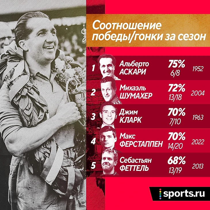 Впрочем, в этом рейтинге есть важные детали: в год седьмого триумфа Шумахера в календаре было 18 гонок – то есть, немец выиграл 72,2% всех Гран-при года, а Ферстаппен в 2022-м провел уже 20 – и это 70% побед от числа всех гонок года.