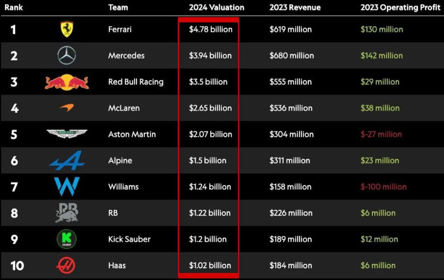 К финалу сезона 2024-го авторитетное американское издание Sportico (принадлежит сыну владельца «Индикара» – имеет сильную экспертизу в автоспорте) выкатило рейтинг стоимостей команд с общей оценкой в 23,1 млрд. Теперь все организации «Ф-1» стоят свыше 1 млрд – даже аутсайдеры.