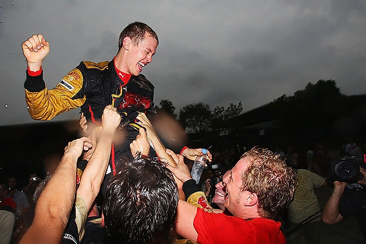 Исторический момент: 14 сентября 2008 года Себастьян Феттель стартовал первым на Гран-при Италии. Позади кипела борьба, Льюис Хэмилтон совершал мощный прорыв с 15-го места (на финише он будет 7-м), в середине заезда пилоты регулярно обменивались позициями, но Себ уверенно и практически безмятежно ехал во главе пелотона. Он уступил лидерство лишь на 4 круга во время волны пит-стопов, но затем вернулся на первое место и без проблем удержался на нем до финиша, а на подиуме показал в телекамеру свой знаменитый палец.