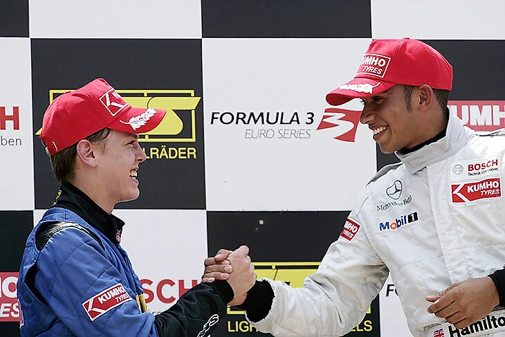 Следующий шаг вперед – «Формула-3», более продвинутая и технологически сложная в сравнении со всем, на чем немец гонял раньше. На привыкание ушло полгода, а затем Себ включился в борьбу за подиумы. На «Лаузицринге» Феттель долго и красиво на равных сражался с лучшим гонщиком серии Льюисом Хэмилтоном, и хотя в итоге в этой дуэли проиграл – все же оставил у зрителей, экспертов и комментаторов самые яркие впечатления.