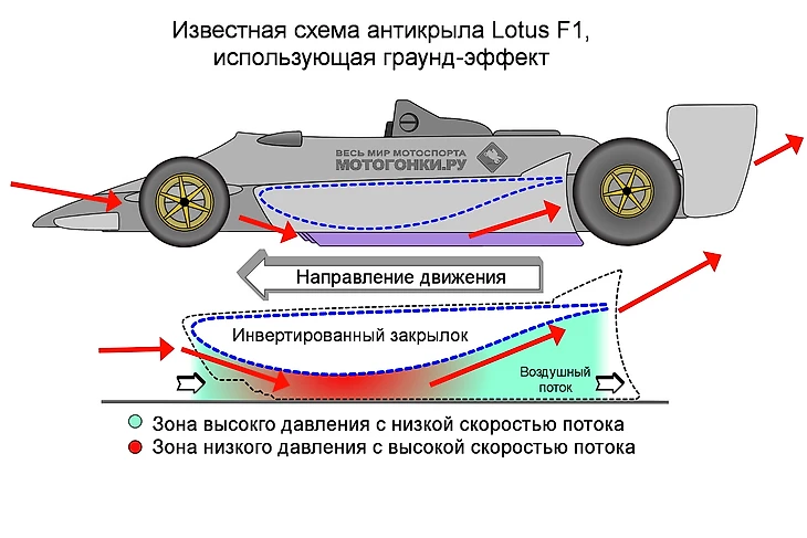 К середине 1970-х годов Радд и Райт перешли в «Лотус», где Колин Чепмен вынашивал похожие мысли. Как сказал Райт в интервью еще 2000 года: «Мы покатались на Рено 4 [самый массовый французский автомобиль] по Хетелю с разными навесными элементами. Когда мы изучили это подробнее, мы обнаружили, что если вы наденете такие вот аэродинамические юбки по бокам, чтобы закрыть туннели Вентури, то это действительно сработает прекрасно. Я знал, что все получится, когда в аэродинамической трубе вращающееся днище прилипло к потолку».