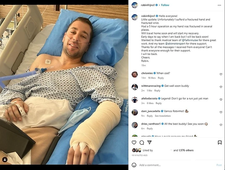 Казалось бы, совершенно обычное столкновение, которых сотни в любой гоночный уик-энд? Однако руль Фряйнса очень жестко перекрутило – вместе с рукой ниделандца.