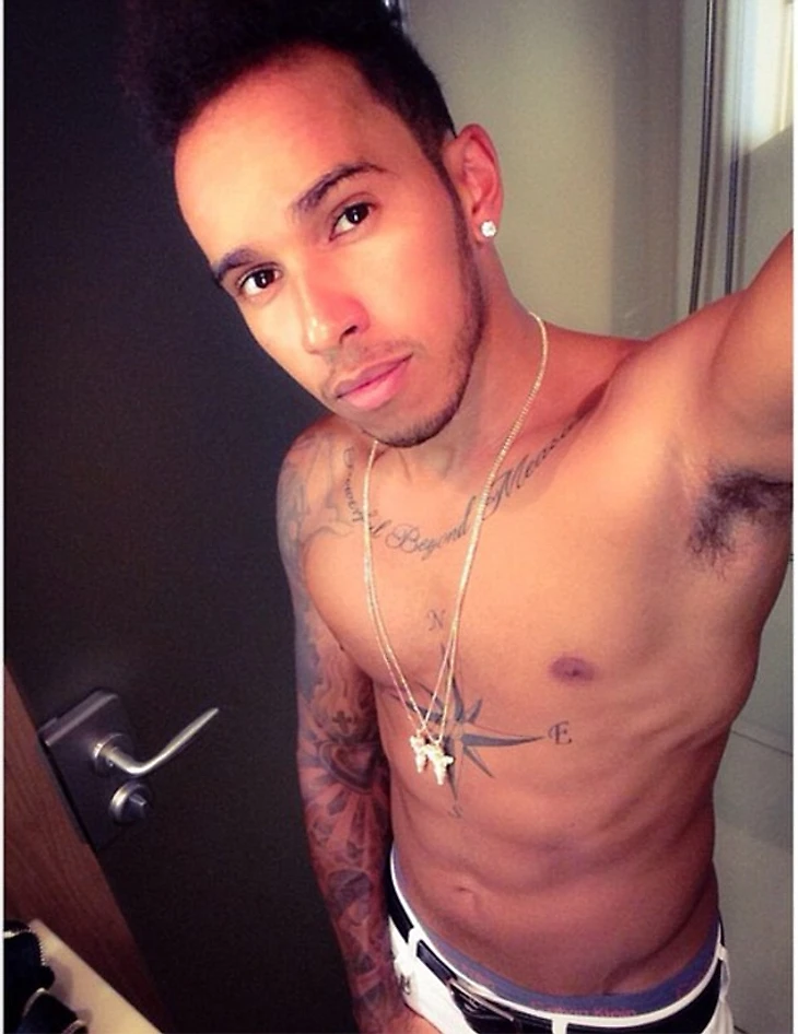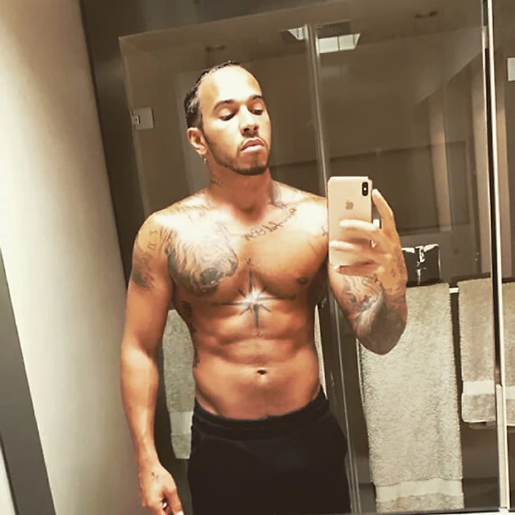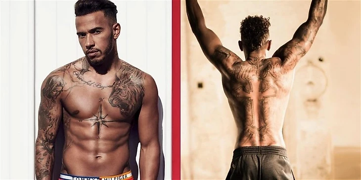 До этого Льюис все равно был в форме, но менее «объемным»: вот кадры из видео GQ 2018-го, где Льюис рассказывал о смысле своих татуировок: