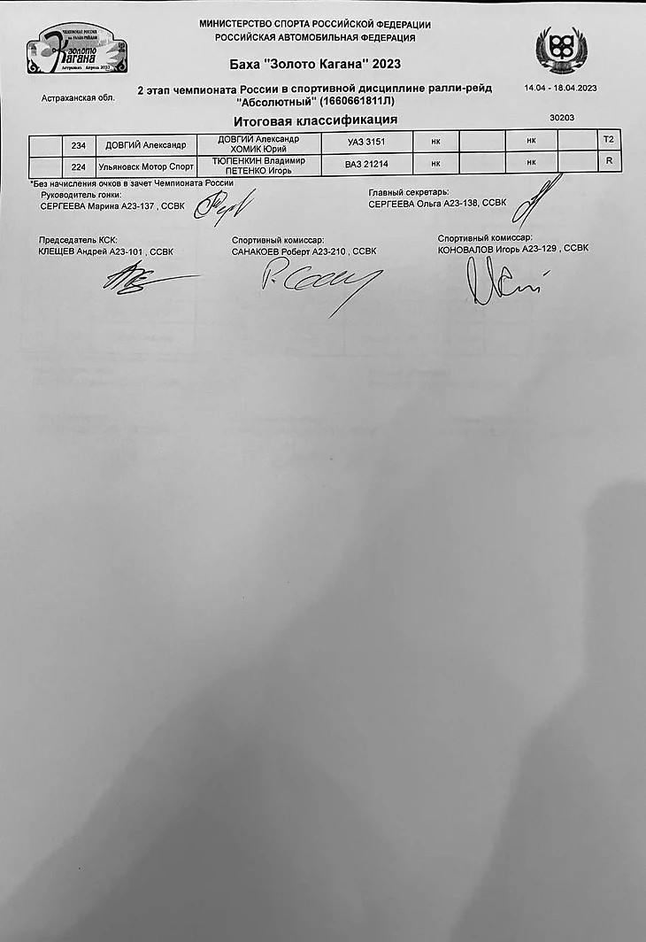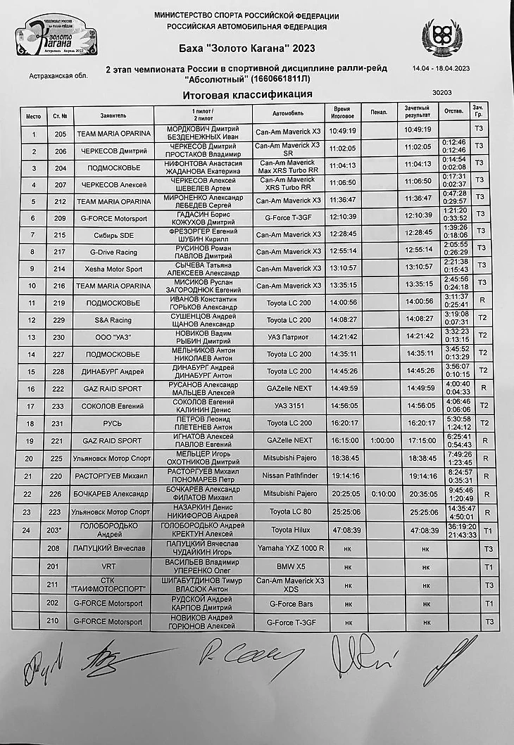 В топ-10 абсолютного зачета вошли также лидеры категорий «Рейд спорт» - Константин Иванов/Александр Горьков и Александр Русанов/Алексей Мальцев, идущие с равным количеством  очков (12), а также экипажи зачета Т3 Александр Мироненко/Сергей Лебедев (10 очков) и Борис Гадасин/Дмитрий Кожухов (8 очков).