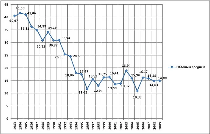 Динамика обгонов по сезонам с 1983 по 2009 годы