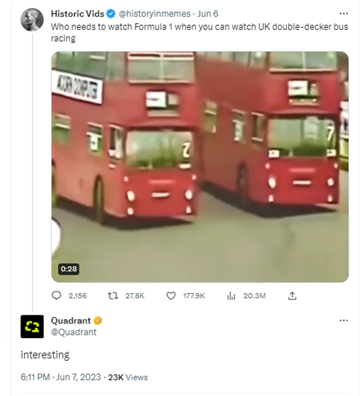 Перед Гран-при Испании популярный твиттер-аккаунт History Vids запостил один гоночный ролик – и сорвал банк в 20 млн просмотров за пару дней, 188к лайков и комментарий виртуальной команды пилота «Ф-1» Ландо Норриса Quadrant «Интересно».